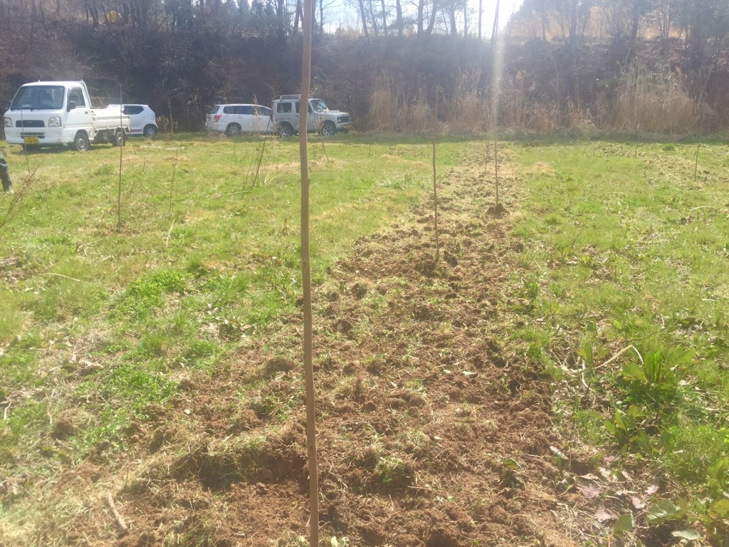 ここ何年かの取り組みである新しい畑の苗木植え付け作業をしています。柿の葉茶用の畑ですがこちらも休耕地。もともとの柿の葉茶用の畑は勾配のある所が多く、この写真のように平地に植えていけるのは後々の収穫作業を考えるととても良い場所です。