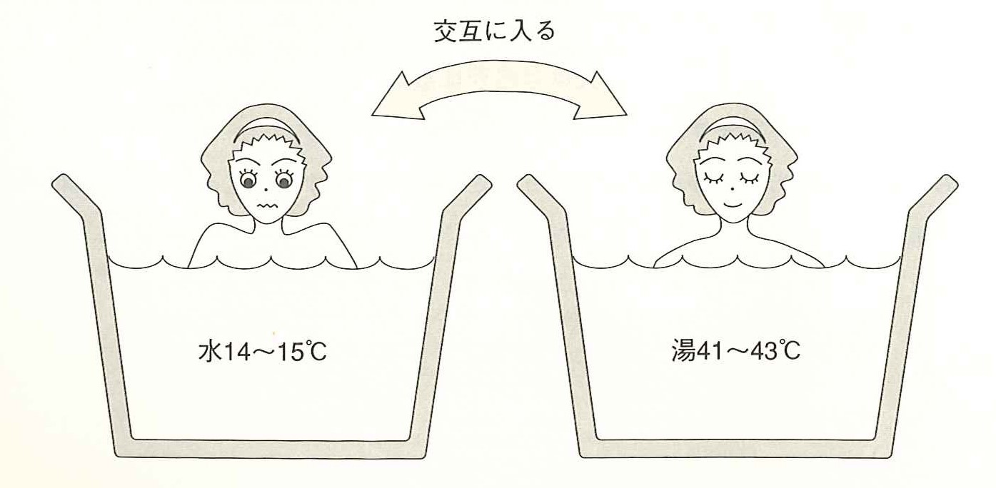初めは水浴1分、次に温浴1分。これを,交互に水5回,湯4回行います。最後は必ず水で仕上げます。5回より少ないと効果が不十分,7回以上では疲労します。