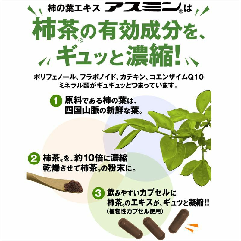 もちろんポリフェノール、コエンザイムQ10などミネラル類もギュッとつまった柿の葉エキス「アスミン」