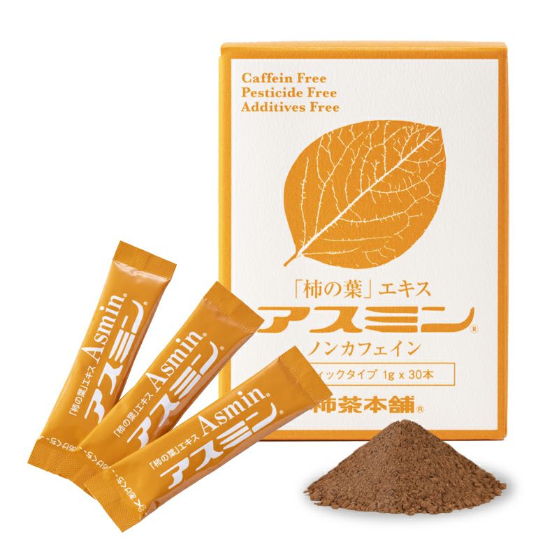 - ●アスミンは柿茶の浸出液を約10倍に濃縮、乾燥しております。主には柿ポリフェノール(柿渋、柿カテキン、フラボノイド、ルチン)、ミネラル類(カリウム)などが特に濃縮されています。