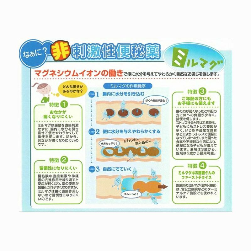 おなかが痛くなりにくい。ミルマグは腸壁を直接刺激せずに、腸内に水分を引き寄せて便をやわらかくして排便を促します。 だから、おなかが痛くなりにくいのです。