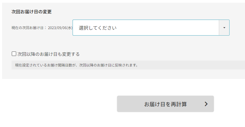 ご希望のお届け日を選択して表示内容に沿って変更を行ってください。次回以降のお届けも同時に変更したい場合は、「次回以降のお届け日も変更する」にチェックを入れてお進みください。